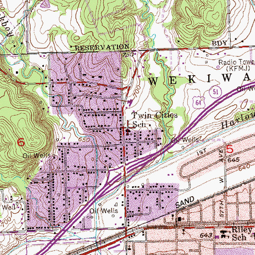 Twin Cities School, Oklahoma Twin Cities School is a school located in Tulsa County, OK at N36.15537° W96.06445° (NAD83) and at an elevation of 692 ft MSL. It can be seen on the USGS 1:24K topographic map Sand Springs, OK.