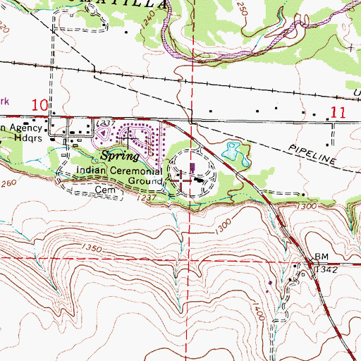 Indian Ceremonial Ground, Oregon Indian Ceremonial Ground is a locale located in Umatilla County, OR at N45.66457° W118.66276° (NAD83) and at an elevation of 1246 ft MSL. It can be seen on the USGS 1:24K topographic map Mission, OR.
