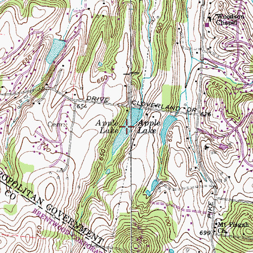 Apple Lake, Tennessee Apple Lake is a reservoir located in Davidson County, TN at N36.02938° W86.75035° (NAD83) and at an elevation of 616 ft MSL. It can be seen on the USGS 1:24K topographic map Oak Hill, TN.