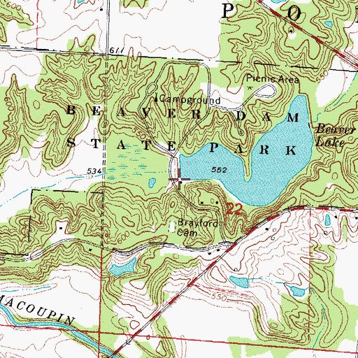 Beaver Lake Dam, Illinois Beaver Lake Dam is a dam located in Macoupin County, IL at N39.21005° W89.97510° (NAD83) and at an elevation of 554 ft MSL. It can be seen on the USGS 1:24K topographic map Plainview, IL.