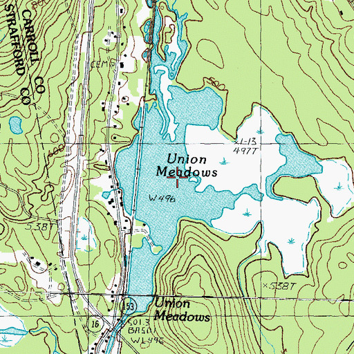Union Meadows Pond, New Hampshire Union Meadows Pond is a lake located in Carroll County, NH at N43.50621° W71.02234° (NAD83) and at an elevation of 495 ft MSL. It can be seen on the USGS 1:24K topographic map Sanbornville, NH.