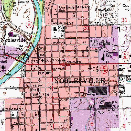 First Presbyterian Church, Indiana First Presbyterian Church is a church located in Hamilton County, IN at N40.04528° W86.00972° (NAD83) and at an elevation of 767 ft MSL. It can be seen on the USGS 1:24K topographic map Noblesville, IN.