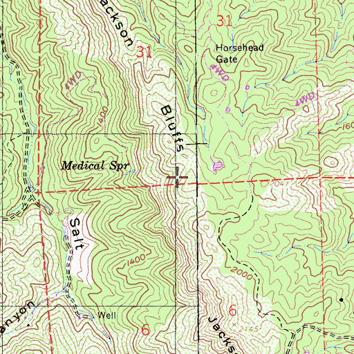 Jackson Bluffs, California Jackson Bluffs is a cliff located in Yolo County, CA at N38.66490° W122.12636° (NAD83) and at an elevation of 1961 ft MSL. It can be seen on the USGS 1:24K topographic map Brooks, CA.
