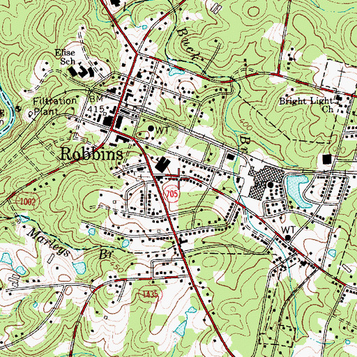 Town of Robbins, North Carolina Town of Robbins is a civil located in Moore County, NC at N35.43033° W79.58362° (NAD83) and at an elevation of 446 ft MSL. It can be seen on the USGS 1:24K topographic map Robbins, NC.