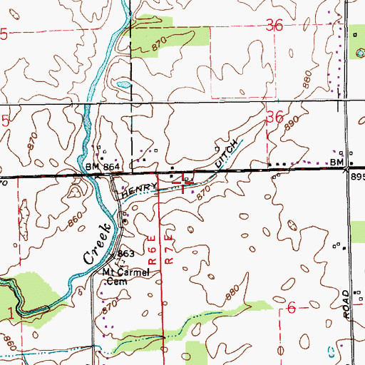 Henry Ditch, Indiana Henry Ditch is a canal located in Hancock County, IN at N39.87088° W85.80192° (NAD83) and at an elevation of 859 ft MSL. It can be seen on the USGS 1:24K topographic map Greenfield, IN.