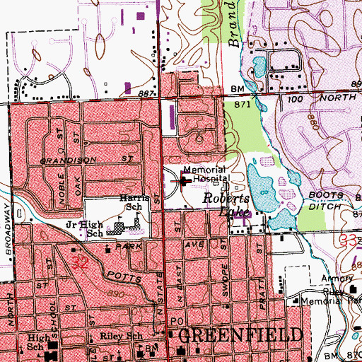 Memorial Hospital, Indiana Memorial Hospital is a hospital located in Hancock County, IN at N39.79504° W85.76831° (NAD83) and at an elevation of 889 ft MSL. It can be seen on the USGS 1:24K topographic map Greenfield, IN.