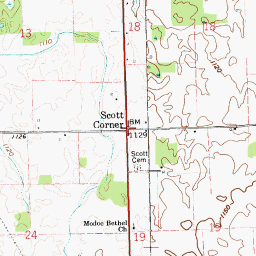 Scott Corner, Indiana Scott Corner is a populated place located in Randolph County, IN at N40.09199° W85.12691° (NAD83) and at an elevation of 1128 ft MSL. It can be seen on the USGS 1:24K topographic map Modoc, IN.