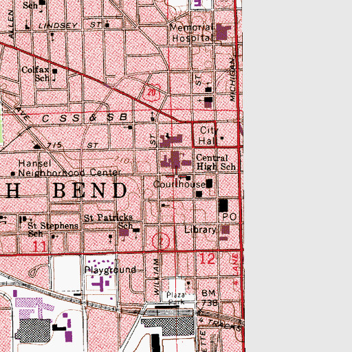 Central High School, Indiana Central High School is a school located in St. Joseph County, IN at N41.67616° W86.25473° (NAD83) and at an elevation of 708 ft MSL. It can be seen on the USGS 1:24K topographic map South Bend West, IN.