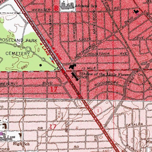 You can view this location or feature in our Topographic Map Viewer now. Click on map above to begin viewing in our Map Viewer. Here are some other places near Shrine of the Little Flower School that may be of interest: