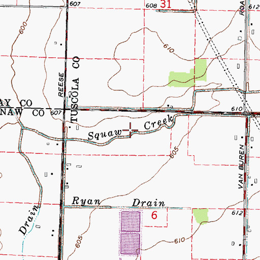 Squaw Creek, Michigan Squaw Creek is a canal located in Tuscola County, MI at N43.47752° W83.69219° (NAD83) and at an elevation of 600 ft MSL. It can be seen on the USGS 1:24K topographic map Reese, MI.