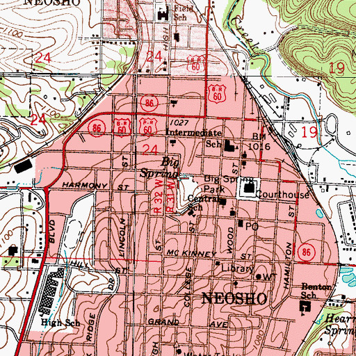 Big Spring, Missouri Big Spring is a spring located in Newton County, MO at N36.86963° W94.37223° (NAD83) and at an elevation of 1043 ft MSL. It can be seen on the USGS 1:24K topographic map Neosho East, MO.
