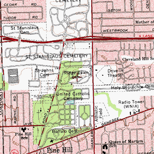 You can view this location or feature in our Topographic Map Viewer now. Click on map above to begin viewing in our Map Viewer. Here are some other places near Ridge Lawn Cemetery that may be of interest: