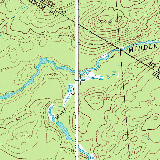 Wolf Creek, New York Wolf Creek is a stream located in Herkimer County, NY at N44.07062° W75.12464° (NAD83) and at an elevation of 1446 ft MSL. It can be seen on the USGS 1:24K topographic map Oswegatchie SE, NY.